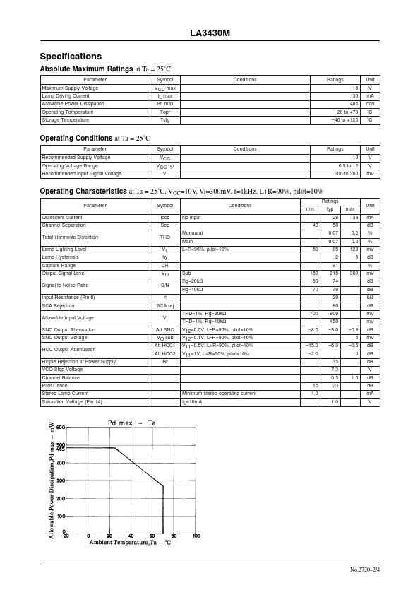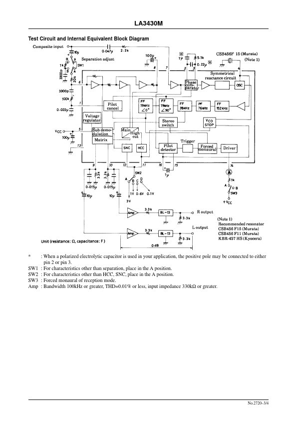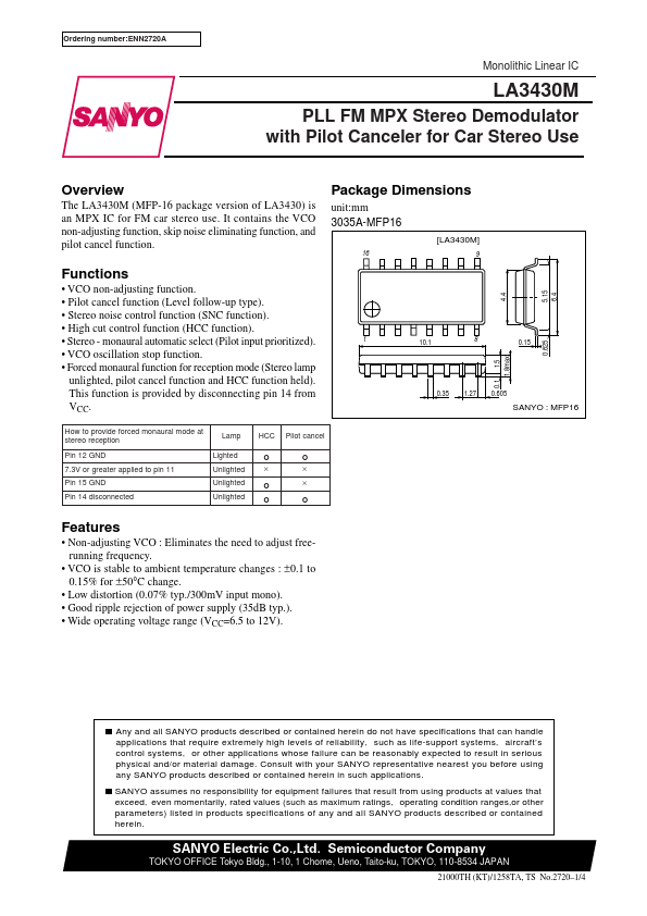 Ordering number:ENN2720A Monolithic Linear IC LA3430M PLL FM MPX Stereo Demodulator with Pilot Canceler for Car Stereo Use Overview The LA3430M (MFP-16 package version of LA3430) is an MPX IC for FM car stereo use. It contains the VCO non-adjusting function, skip noise eliminating function, and pilot cancel function. Functions VCO non-adjusting function.
