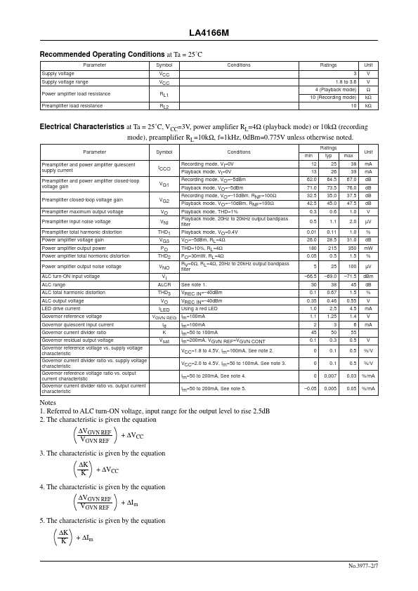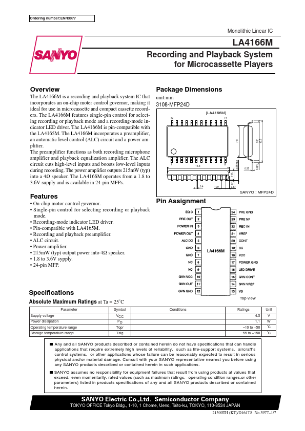Ordering number:ENN3977 Monolithic Linear IC LA4166M Recording and Playback System for Microcassette Players Overview The LA4166M is a recording and playback system IC that incorporates an on-chip moter control governor, making it ideal for use in microcassette and pact cassette recorders.
