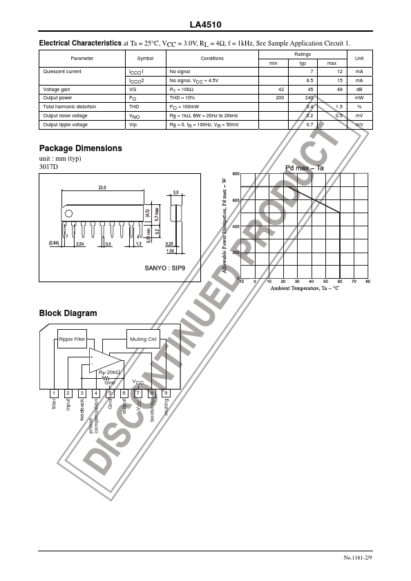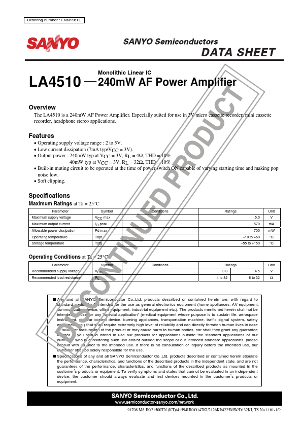 ENN1161E Monolithic Linear IC LA4510 240mW AF Power Amplifier Overview The LA4510 is a 240mW AF Power Amplifier. Especially suited for use in 3V micro cassette recorder, mini cassette recorder, headphone stereo applications.