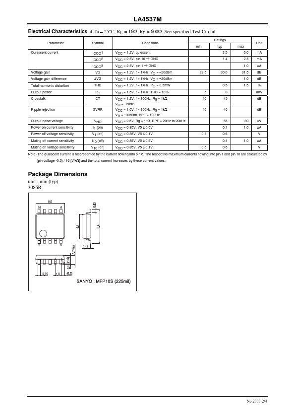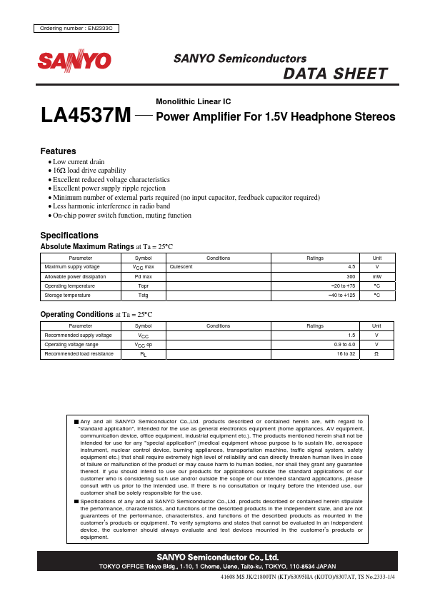 EN2333C LA4537M Monolithic Linear IC Power Amplifier For 1.5V Headphone Stereos.