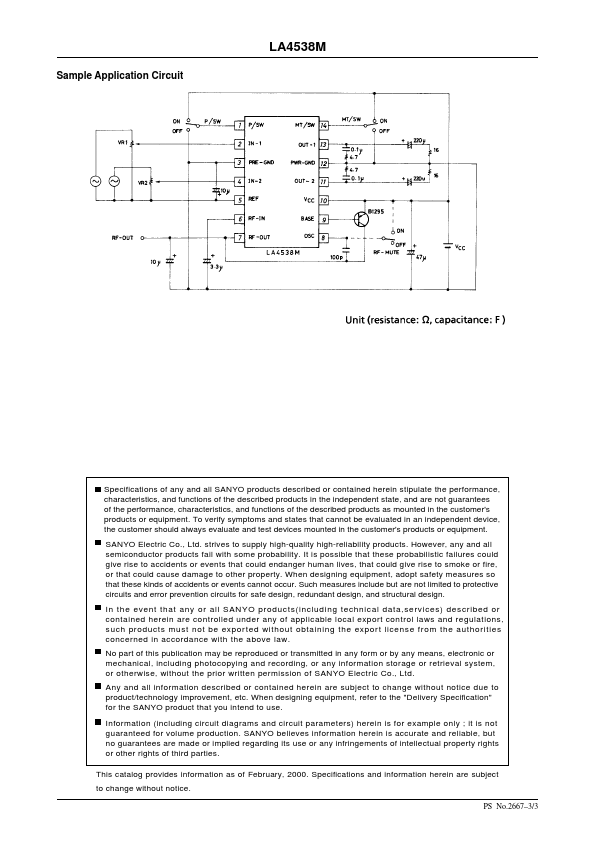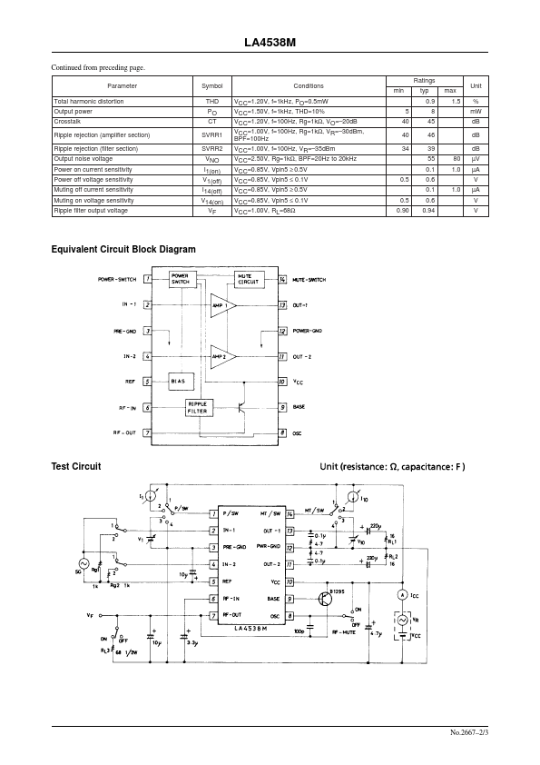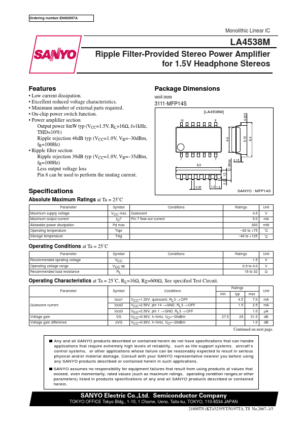 Ordering number:ENN2667A Monolithic Linear IC LA4538M Ripple Filter-Provided Stereo Power Amplifier for 1.5V Headphone Stereos 0.625.