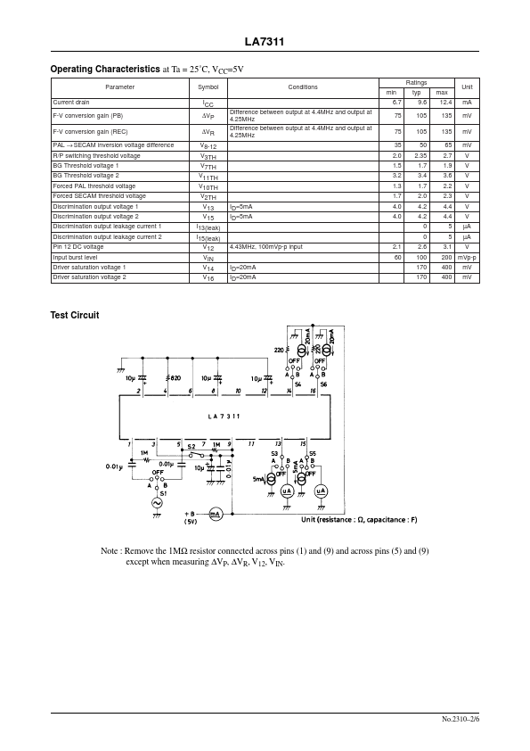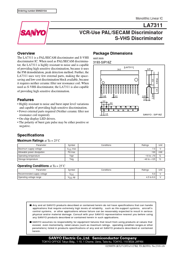 Ordering number:ENN2310A Monolithic Linear IC LA7311 VCR-Use PAL/SECAM Discriminator S-VHS Discriminator Overview The LA7311 is a PAL/SECAM discriminator and S-VHS discriminator IC. When used as PAL/SECAM discriminator, the LA7311 is highly resistant to noise and is capable of providing high sensitive discrimination, because it uses the FM demodulation, peak detection method. Further, the LA7311 uses very few...