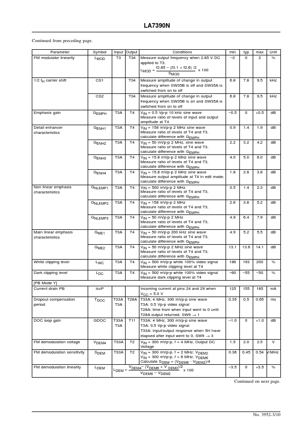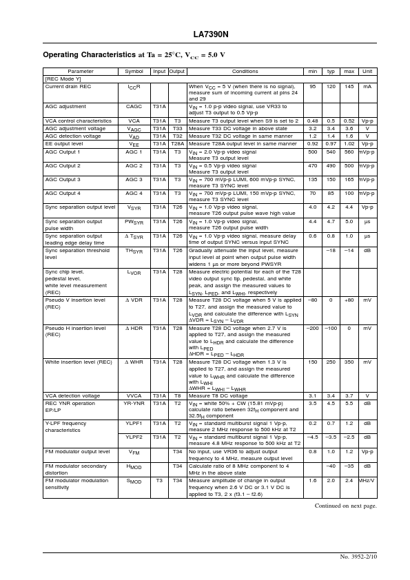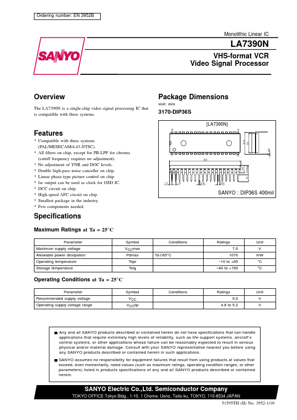 EN 3952B Monolithic Linear IC LA7390N VHS-format VCR Video Signal Processor Overview The LA7390N is a single-chip video signal processing IC that is patible with three systems.