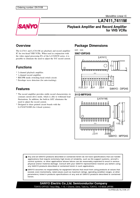 EN 5108 Monolithic Linear IC LA7411,7411M Playback Amplifier and Record Amplifier for VHS VCRs Overview The LA7411 and LA7411M are playback and record amplifier IC for two-head VHS VCRs. When used in conjunction with the video signal processing ICs of the LA7420/30 series, it is possible to eliminate the need to adjust the Y/C record current. Package Dimensions unit.