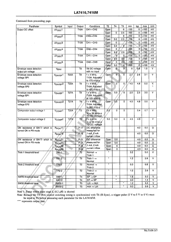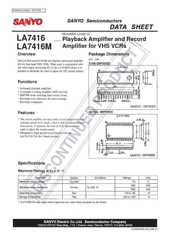 EN 5109 LA7416 LA7416M Monolithic Linear IC Playback Amplifier and Record Amplifier for VHS VCRs.