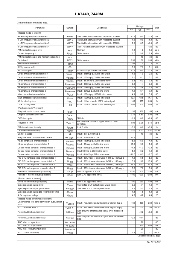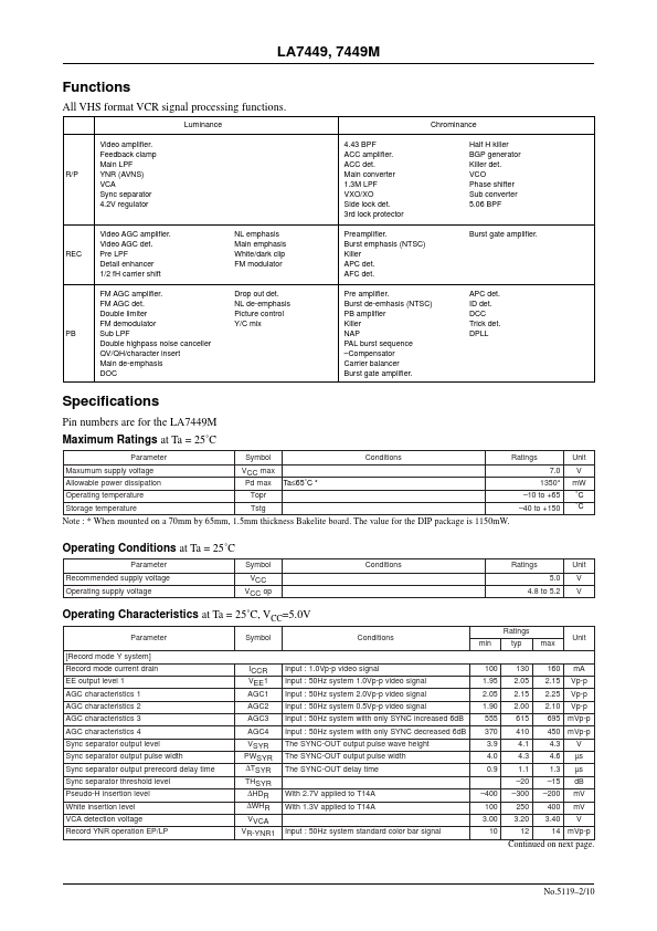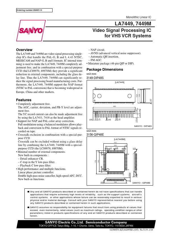 Ordering number:ENN5119 Monolithic Linear IC LA7449, 7449M Video Signal Processing IC for VHS VCR Systems Overview The LA7449 and 7449M are video signal processing singlechip ICs that handle the PAL-G, B and I, 4.43 NTSC, MESECAM and NAP-G, B and I formats. IC internal trimming is used to make the LA7449, 7449M pletely adjustment free, and in bination with a special-purpose CCD (thd LC89970, 89970M) they provide a...