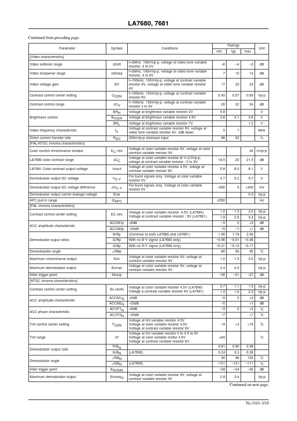 Ordering number:ENN3343A Monolithic Linear IC LA7680, 7681 Sigle-Chip Signal Processor for Color TV Use Overview Package Dimensions The LA7680 and LA7681 signal processors provide all the ponents required to decode PAL or NTSC Color television signals. On-chip circuits include VIF, SIF, a video processor, a chroma demodulator, and deflection drivers. unit:mm 3149-DIP48S [LA7680, 7681] The self-adjusting signal...
