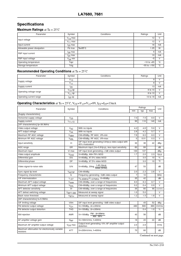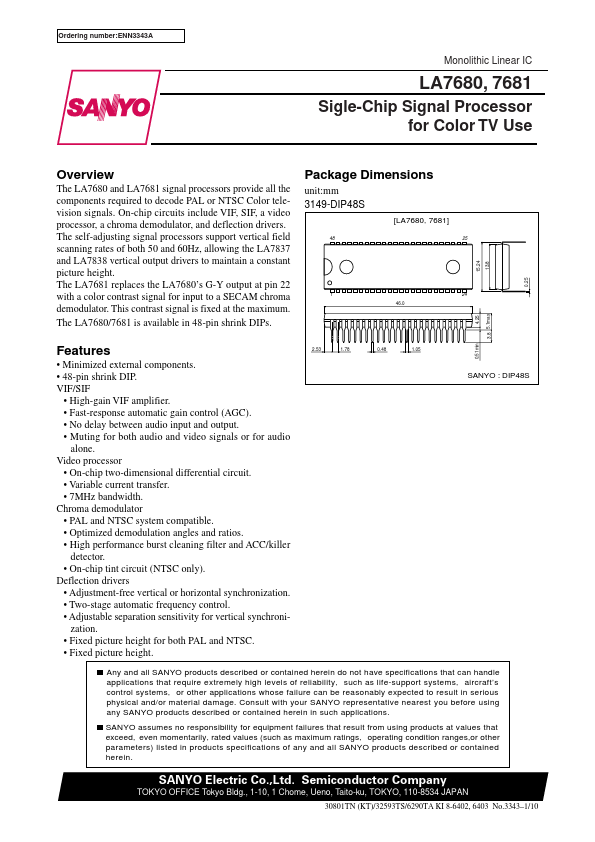 Ordering number:ENN3343A Monolithic Linear IC LA7680, 7681 Sigle-Chip Signal Processor for Color TV Use Overview Package Dimensions The LA7680 and LA7681 signal processors provide all the ponents required to decode PAL or NTSC Color television signals. On-chip circuits include VIF, SIF, a video processor, a chroma demodulator, and deflection drivers. unit:mm 3149-DIP48S [LA7680, 7681] The self-adjusting signal...