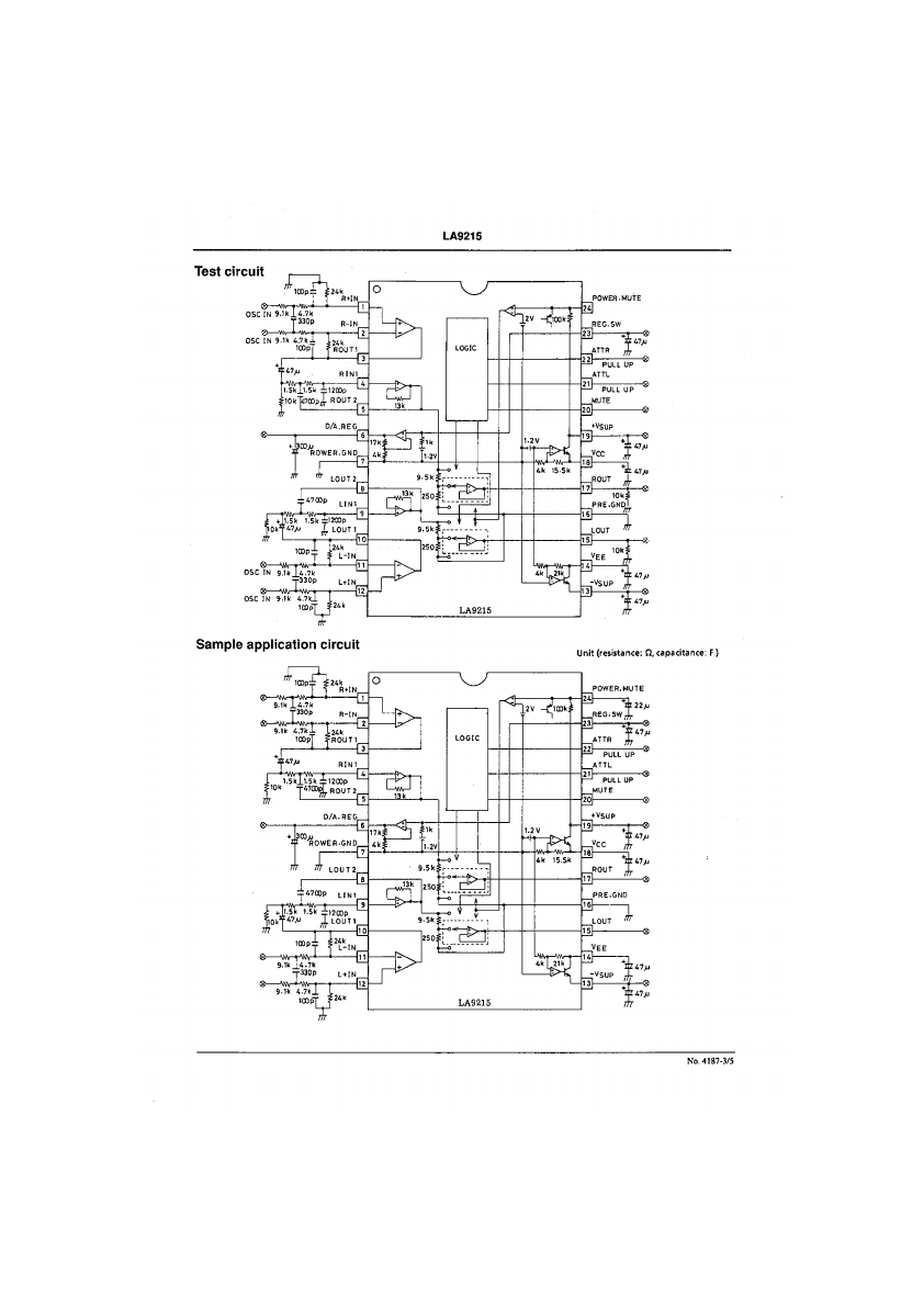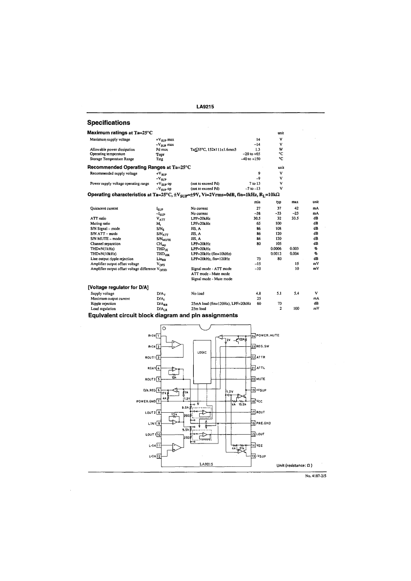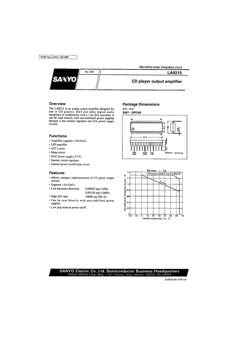 Ordering number:EN4187 SANYO, No. 4187 Monolithic linear integrated circuit LA9215 CD player output amplifier Overview The LA9215 is an analog output amplifier designed for use in CD players, DAT and other digital audio equipment in bination with a 1-bit D/A converter. It can be used directly with non-stabilized power supplies because it has internal regulator and D/A power supply circuits.