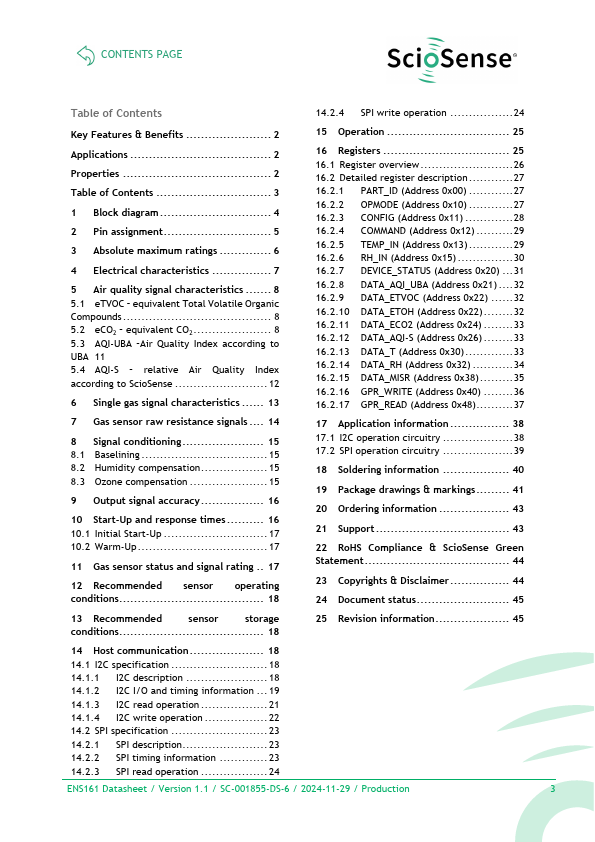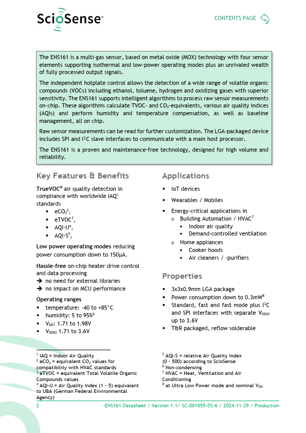 The independent hotplate control allows the detection of a wide range of volatile organic compounds (VOCs) including ethanol, toluene, hydrogen and oxidizing gases with superior sensitivity. The ENS161 supports intelligent algorithms to process raw sensor measurements on-chip.