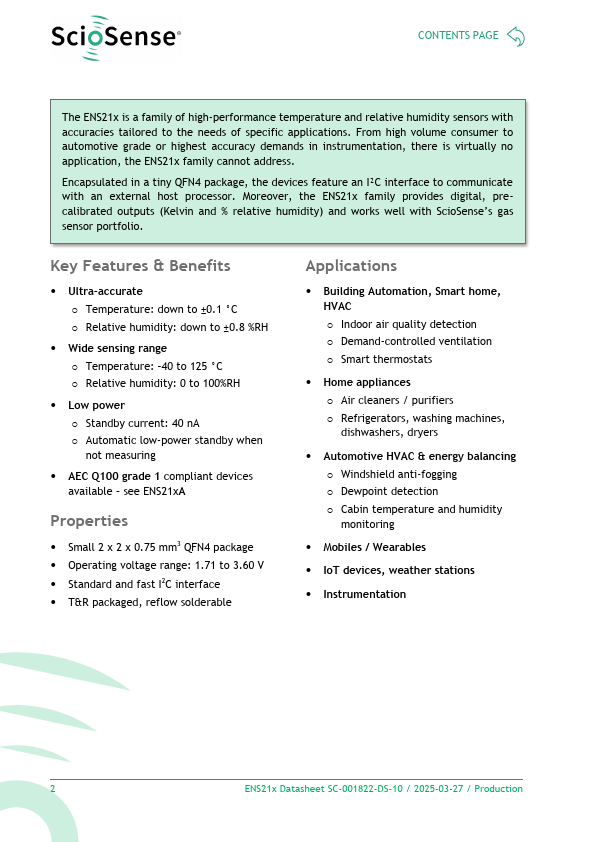 ENS21x High Performance Family of Digital Humidity and Temperature Sensors ENS21x datasheet Version: 2025-03-27 Document Status: ENS213A & ENS215 CONTENTS PAGE The ENS21x is a family of high-performance temperature and relative humidity sensors with accuracies tailored to the needs of specific applications.