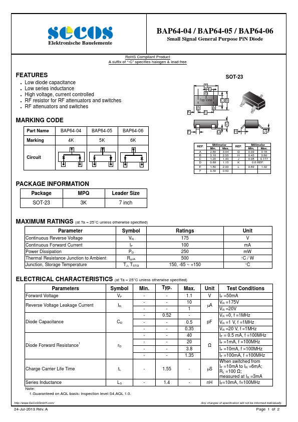 Elektronische Bauelemente BAP64-04 / BAP64-05 / BAP64-06 Small Signal General Purpose PiN Diode RoHS pliant Product A suffix of ā-Cā specifies halogen & lead-free.