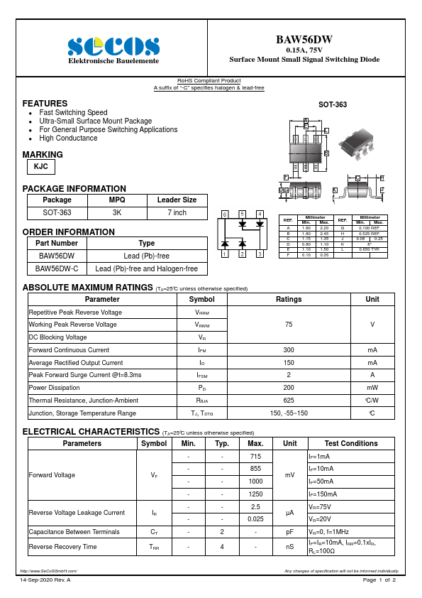 Elektronische Bauelemente BAW56DW 0.15A, 75V Surface Mount Small Signal Switching Diode RoHS pliant Product A suffix of ā-Cā specifies halogen & lead-free.