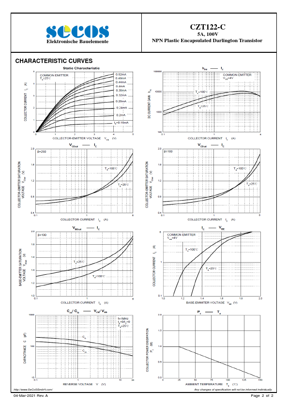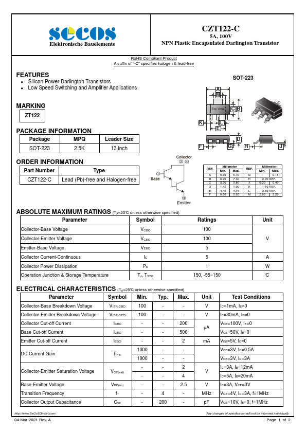 Overview: Elektronische Bauelemente CZT122-C 5A, 100V NPN Plastic Encapsulated Darlington Transistor RoHS pliant Product A suffix of ā-Cā specifies halogen &.