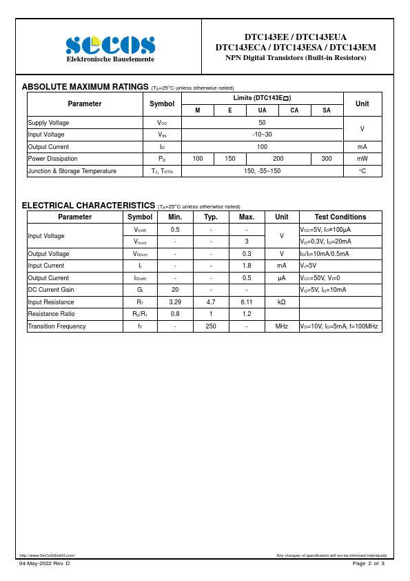 | Datasheet | DTC143EM-SeCoS.pdf |