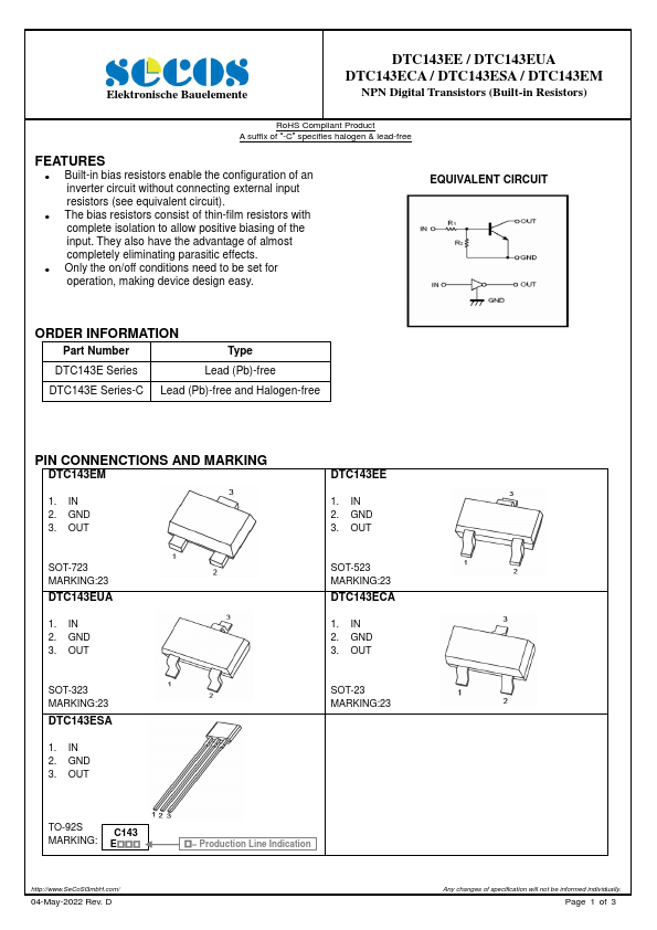 Overview: Elektronische Bauelemente DTC143EE / DTC143EUA DTC143ECA / DTC143ESA / DTC143EM NPN Digital Transistors (Built-in Resistors) RoHS pliant Product A suffix of ā-Cā specifies halogen &.