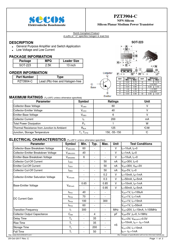 Overview: Elektronische Bauelemente PZT3904-C NPN Silicon Silicon Planar Medium Power Transistor RoHS Compliant Product A suffix of “-C” specifies halogen &.