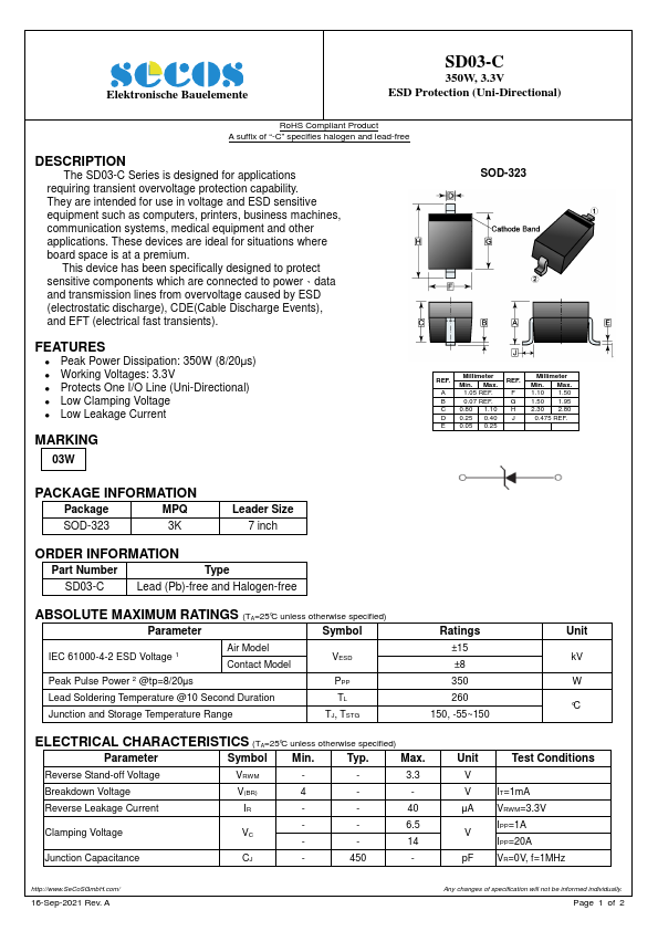 The SD03-C Series is designed for applications requiring transient overvoltage protection capability. They are intended for use in voltage and ESD sensitive equipment such as puters, printers, business machines, munication systems, medical equipment and other applications. These devices are ideal for situations where board space is at a premium.