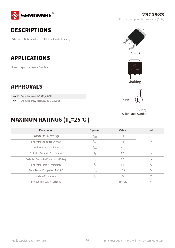 S Silicon NPN Transistor In a TO-252 Plastic Package APPLICATIONS Low Frequency Power Amplifier APPROVALS RoHS Compliance with 2011/65/EU HF Compliance with IEC61249-2-21:2003 MAXIMUM RATINGS (TA=25°C ) Parameter Collector to Base Voltage Collector to Emitter Voltage Emitter to Base Voltage Collector Current - Continuous Collector Current ‒ Continuous(Pulse) Collector Power Dissipation Total Power Dissipation TC=25℃ Junction Temperature Storage Temperature Range Symbol VCBO VCEO VEBO IC ICP PC Ptot TJ TSTG 2SC2983 Plastic-Encapsulate Transistor (NPN) C BC E TO-252 2SC2983 Marking C (2) B (1) E (3) Schematic Symbol Value 180 160 5.0 1.5 3.0 1.0 1.25 150 -55~+150 Unit V A A W W ℃ ℃ Product Datasheet Rev.