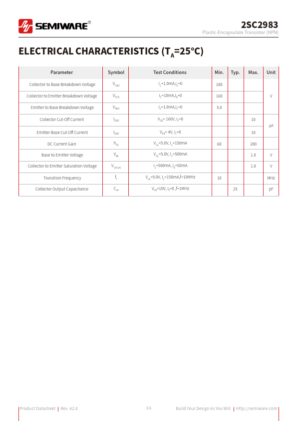 A2.0 1/6 Build Your Design As You Will Http://semiware.com R 2SC2983 Plastic-Encapsulate Transistor (NPN) ELECTRICAL CHARACTERISTICS (TA=25°C) Parameter Collector to Base Breakdown Voltage Collector to Emitter Breakdown Voltage Emitter to Base Breakdown Voltage Collector Cut-Off Current Emitter-Base Cut-Off Current DC Current Gain Base to Emitter Voltage Collector to Emitter Saturation Voltage Transition Frequency Collector Output Capacitance Symbol VCBO VCEO VEBO ICBO IEBO hFE VBE VCE(sat) fT Cob Test Conditions IC=1.0mA,IE=0 IC=10mA,IB=0 IE=1.0mA,IC=0 VCB= 160V, IE=0 VEB= 4V, IC=0 VCE=5.0V, IC=150mA VCE=5.0V, IC=500mA IC=500mA, IB=50mA VCE=5.0V, IC=150mA,f=10MHz VCB=10V, IE=0 ,f=1MHz Min.