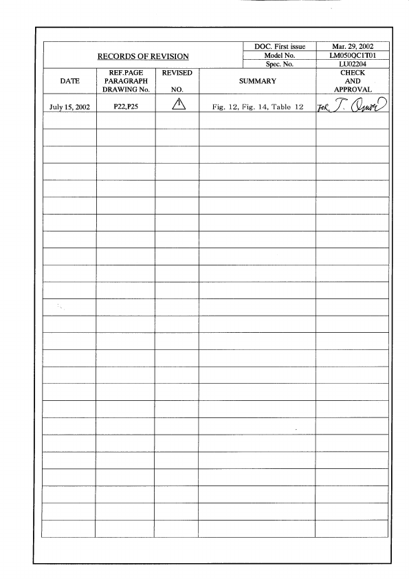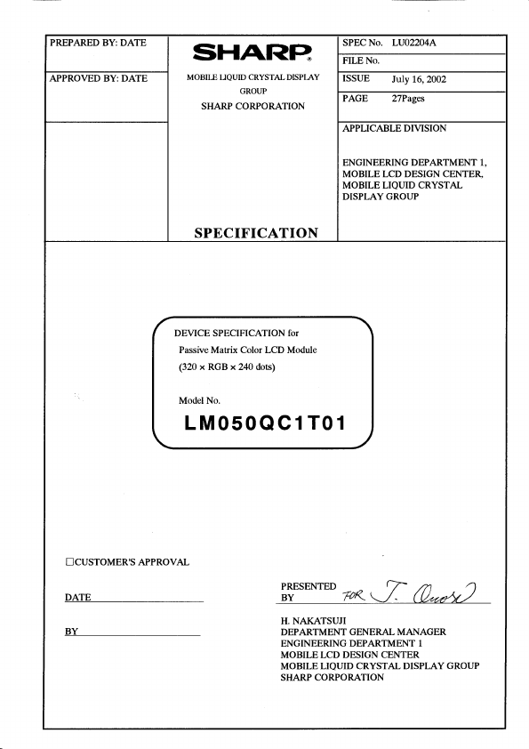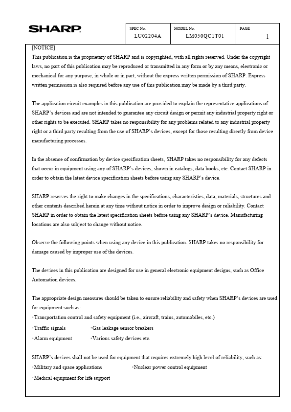 PAGE LU02204A LM050QC1T01 1 [NOTICE] This publication is the proprietary of SHARP and is copyrighted, with all rights reserved. Under the copyright laws, no part of this publication may be reproduced or transmitted in any form or by any means, electronic or mechanical for any purpose, in whole or in part, without the express written permission of SHARP. Express written permission is also required before any use of...