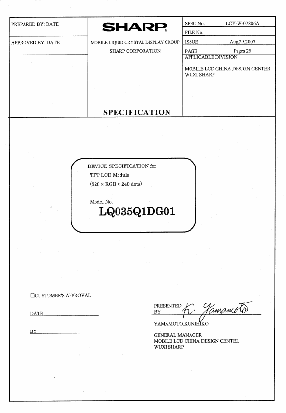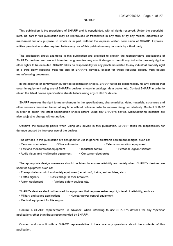 NOTICE LCY-W-07806A Page 1 of 27 This publication is the proprietary of SHARP and is copyrighted, with all rights reserved. Under the copyright laws, no part of this publication may be reproduced or transmitted in any form or by any means, electronic or mechanical for any purpose, in whole or in part, without the express written permission of SHARP. Express written permission is also required before any use of this...