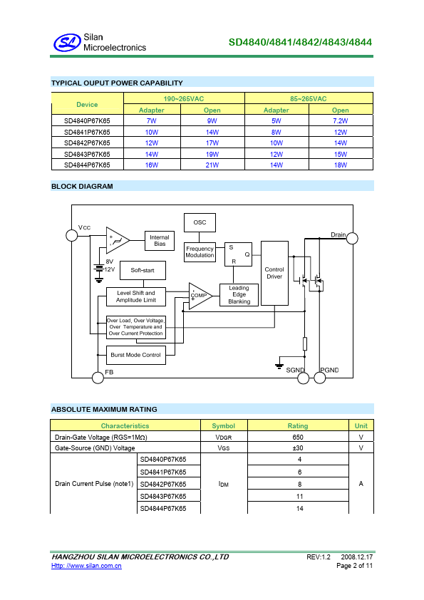 SD4840/4841/4842/4843/4844 is a current mode PWM controller with low standby power and low start current for power switch. In standby mode, the circuit enters burst mode to reduce the standby power dissipation. The switch frequency is 67KHz with ±2.5 KHz jitter frequency for low EMI.