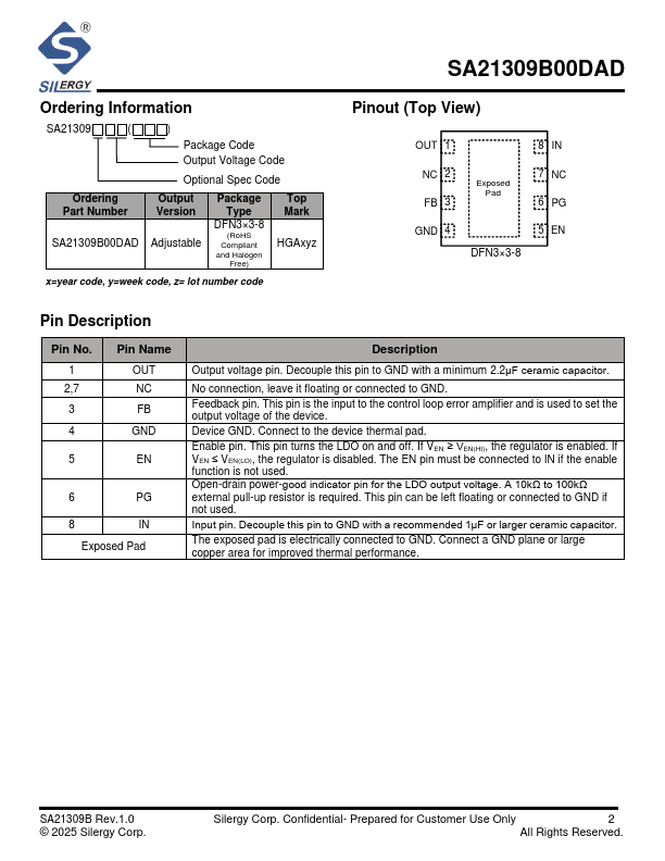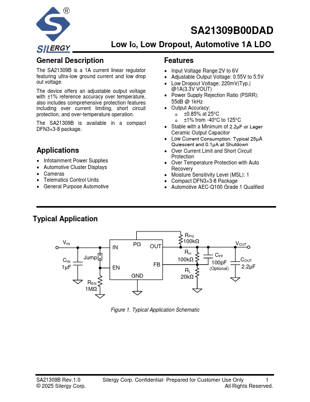 The SA21309B is a 1A current linear regulator featuring ultra-low ground current and low drop out voltage. The device offers an adjustable output voltage with ±1% reference accuracy over temperature, also includes prehensive protection.
