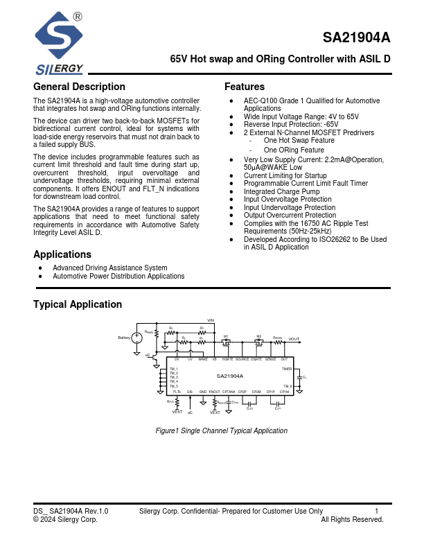 The SA21904A is a high-voltage automotive controller that integrates hot swap and ORing functions internally. The device can driver two back-to-back MOSFETs for bidirectional current control, ideal for systems with load-side energy reservoirs that must not drain back to a failed supply BUS.