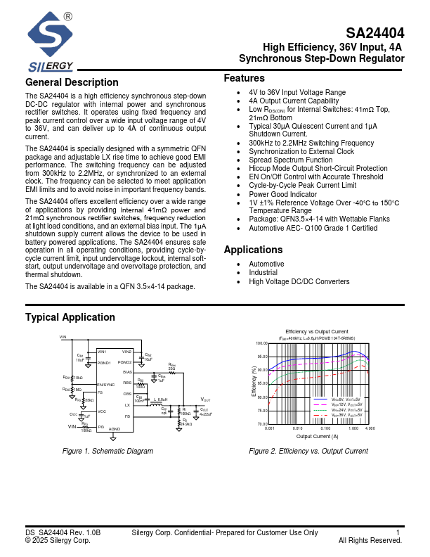 The SA24404 is a high efficiency synchronous step-down DC-DC regulator with internal power and synchronous rectifier switches. It operates using fixed frequency and peak current control over a wide input voltage range of 4V to 36V, and can deliver up to 4A of continuous output current.