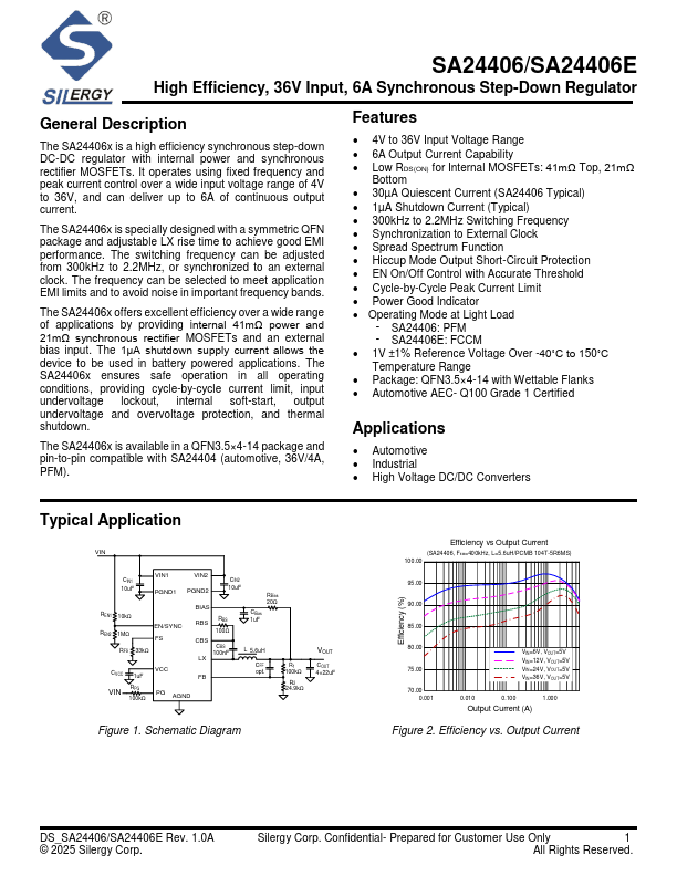 The SA24406x is a high efficiency synchronous step-down DC-DC regulator with internal power and synchronous rectifier MOSFETs. It operates using fixed frequency and peak current control over a wide input voltage range of 4V to 36V, and can deliver up to 6A of continuous output current. The SA24406x is specially designed with a symmetric QFN package and adjustable LX rise time to achieve good EMI performance.