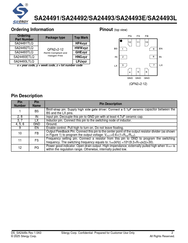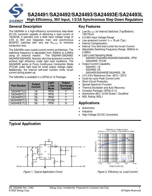 The SA2449x is a high-efficiency synchronous step-down DC-DC converter capable of delivering a load current of 1A/2A/3A. It operates over a wide input voltage range of 4.5V to 36V and integrates main and synchronous MOSFET switches with very low RDS(ON) to minimize conduction loss. The SA2449x uses a peak current control architecture.