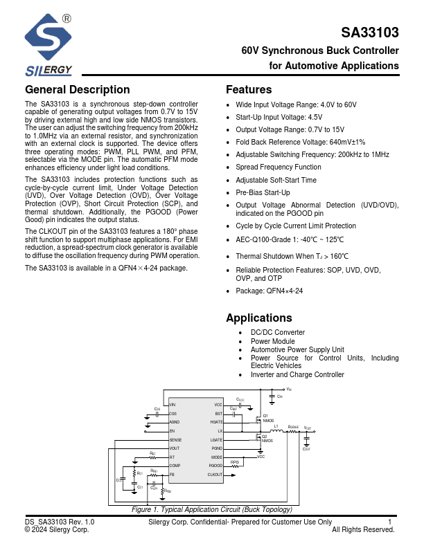 The SA33103 is a synchronous step-down controller capable of generating output voltages from 0.7V to 15V by driving external high and low side NMOS transistors.