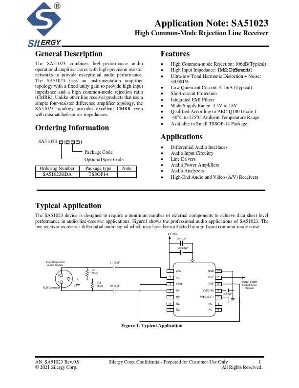 The SA51023 bines high-performance audio operational amplifier cores with high-precision resistor networks to provide exceptional audio performance. The SA51023 uses an instrumentation amplifier topology with a fixed unity gain to provide high input impedance and a high mon-mode rejection ratio (CMRR). Unlike other line receiver products that use a simple four-resistor difference amplifier topology, the SA51023...