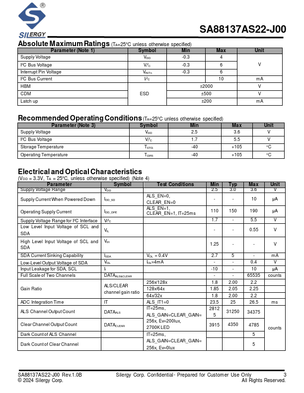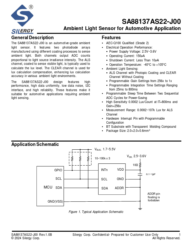 The SA88137AS22-J00 is an automotive-grade ambient light sensor. It feat ures two photodiode arrays manufactured using different coating processes to sense ambient light. Both channels out put ADC counts proportional to light source irradiance intensity.