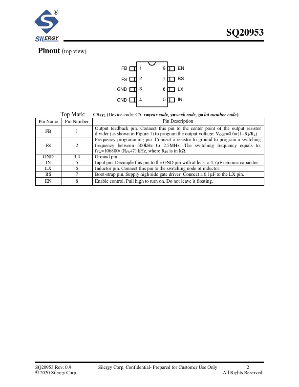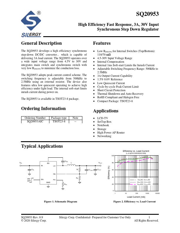 The SQ20953 develops a high efficiency synchronous step-down DC/DC converter , which is capable of delivering 3A load current. The SQ20953 operates over a wide input voltage range from 4.5V to 30V and integrates main switch and synchronous switch with very low RDS(ON) to minimize the conduction loss. The SQ20953 adopts peak current control scheme.