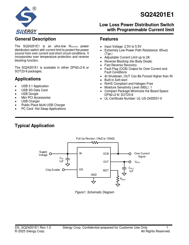 The SQ24201E1 is an ultra-low RDS(ON) power distribution switch with current limit to protect the power source from over current and short circuit conditions.