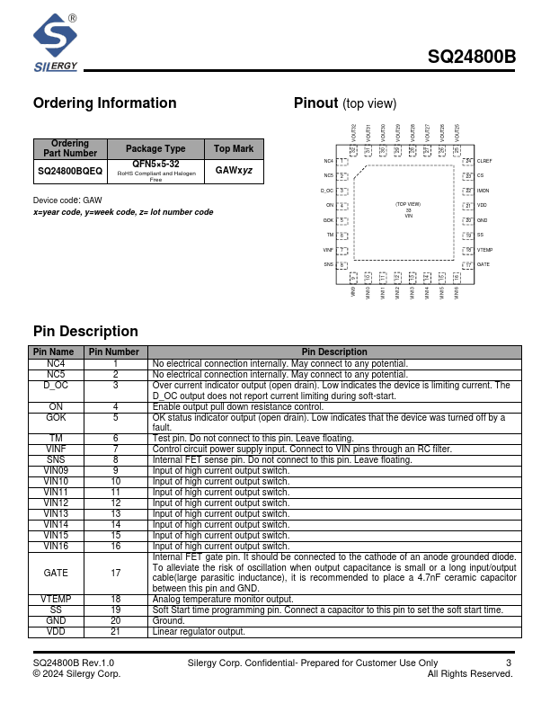 The SQ24800B is a 0.76mΩ ultra-low on-resistance with integrated N-Channel MOSFET efuse for use in high current applications such as base stations and servers. It integrates overcurrent protection, soft-start capabilities to reduce inrush current and high accurate current monitor. The SQ24800B is available in a pact QFN5mm×5mm- 32 package.
