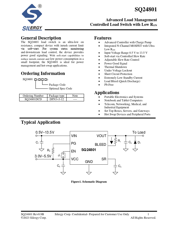 The SQ24801 load switch is an ultra-low on resistance, pact device with inrush current limit via soft−start. For system status monitoring and downstream load control, the device provides power good signaling. With soft-start capabilities to reduce inrush current and low power consumption in a small footprint, the SQ24801 is ideal for power management and hot-swap applications.
