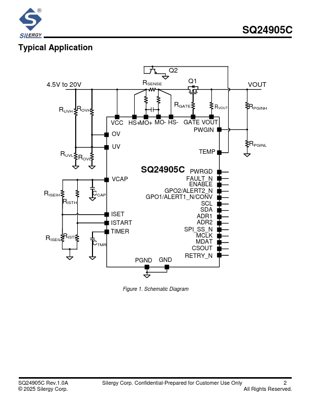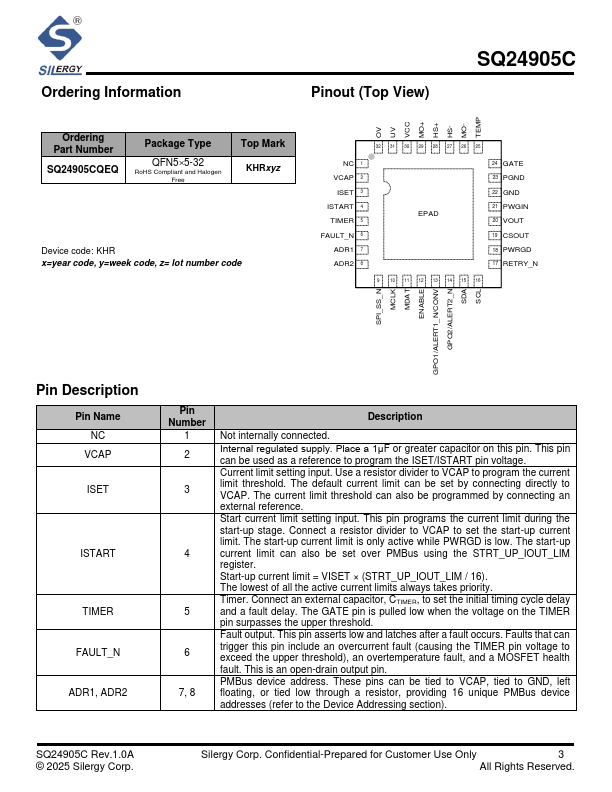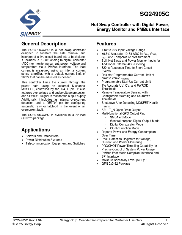 The SQ24905CQEQ is a hot swap controller designed to facilitate the safe removal and insertion of a live circuit board into a backplane. It includes a 12-bit analog-to-digital converter (ADC) for monitoring current, power, voltage and temperature via a PMBus interface. The load current is measured using an internal current sense amplifier, with a default current limit of 20mV that can be adjusted as needed.