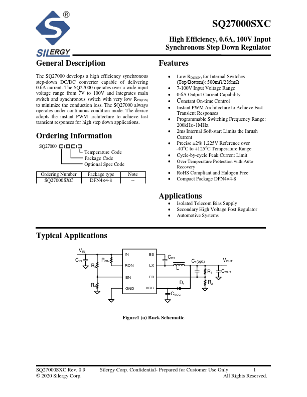 The SQ27000 develops a high efficiency synchronous step-down DC/DC converter capable of delivering 0.6A current. The SQ27000 operates over a wide input voltage range from 7V to 100V and integrates main switch and synchronous switch with very low RDS(ON) to minimize the conduction loss. The SQ27000 always operates under continuous condition mode.