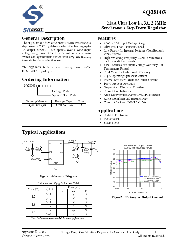 The SQ28003 is a high efficiency 2.2MHz synchronous step down DC/DC regulator capable of delivering up to 3A output current. It can operate over a wide input voltage range from 2.5V to 5.5V and integrates main switch and synchronous switch with very low RDS (ON) to minimize the conduction loss. The SQ28003 is in a space saving, low profile DFN1.5×1.5-6 package.
