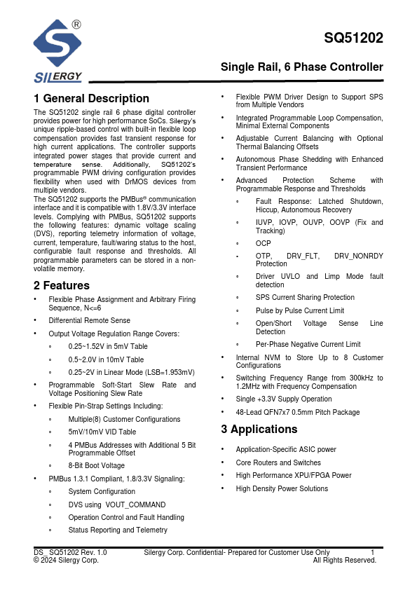 The SQ51202 single rail 6 phase digital controller provides power for high performance SoCs.