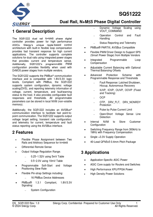 The SQ51222 dual rail N+M≤5 phase digital controller provides power for high performance ASICs.