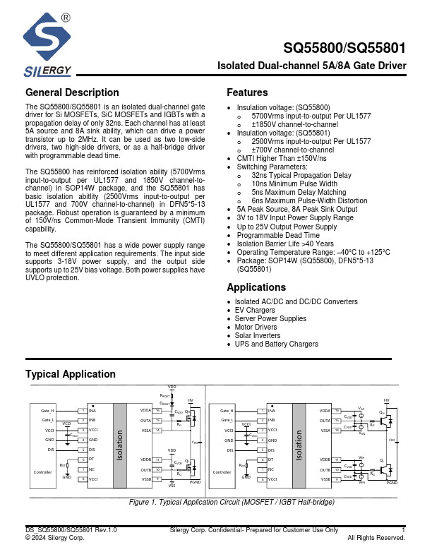 The SQ55800/SQ55801 is an isolated dual-channel gate driver for Si MOSFETs, SiC MOSFETs and IGBTs with a propagation delay of only 32ns. Each channel has at least 5A source and 8A sink ability, which can drive a power transistor up to 2MHz. It can be used as two low-side drivers, two high-side drivers, or as a half-bridge driver with programmable dead time.