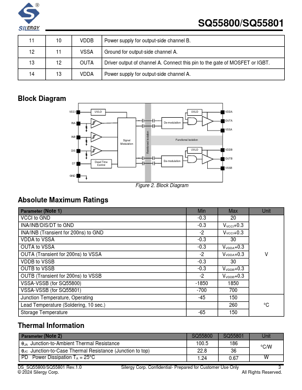 - Insulation voltage: (SQ55801) o 2500Vrms input-to-output Per UL1577 o ±700V channel-to-channel