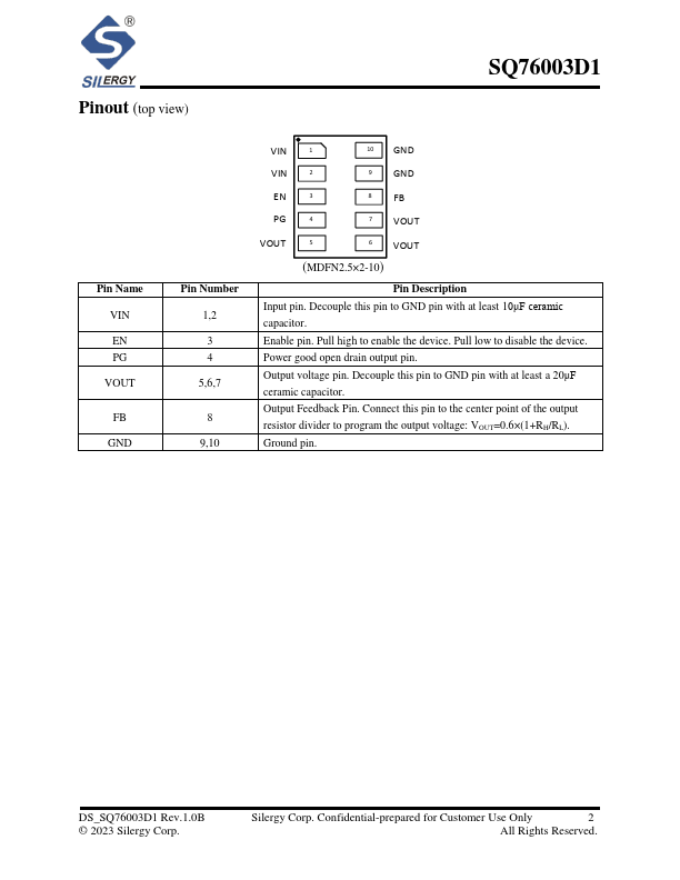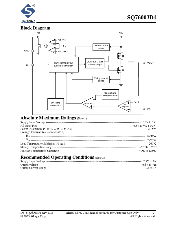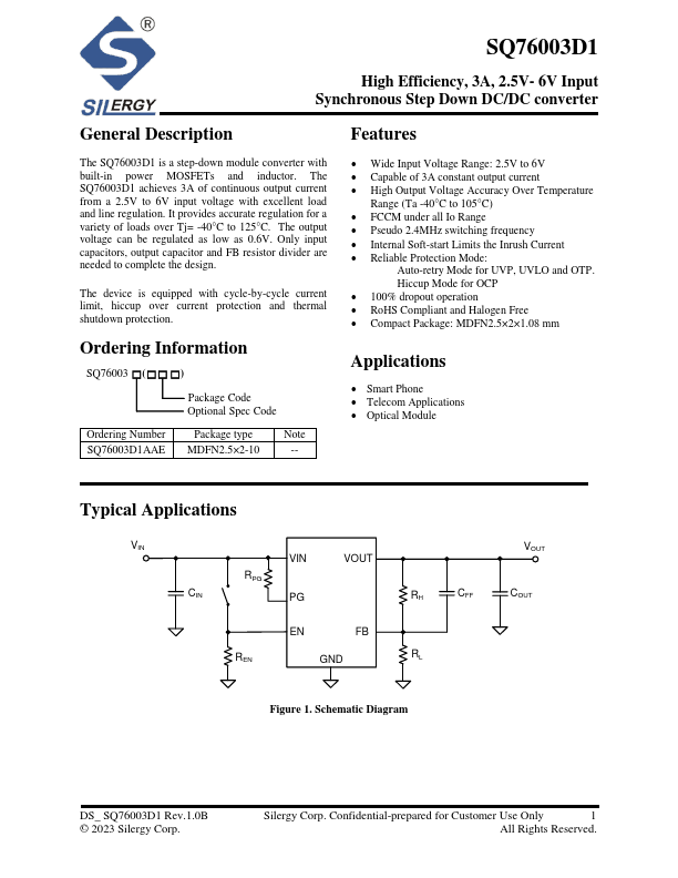The SQ76003D1 is a step-down module converter with built-in power MOSFETs and inductor. The SQ76003D1 achieves 3A of continuous output current from a 2.5V to 6V input voltage with excellent load and line regulation. It provides accurate regulation for a variety of loads over Tj= -40°C to 125°C.