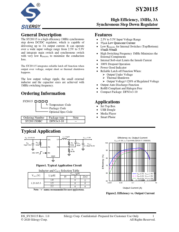 The SY20115 is a high efficiency 1MHz synchronous step down DC/DC regulator, which is capable of delivering up to 3A output current. It can operate over a wide input voltage range from 2.5V to 5.5V and integrate main switch and synchronous switch with very low RDS(ON) to minimize the conduction loss.