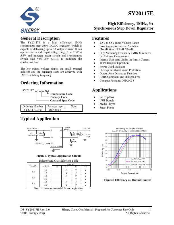 The SY20117E is a high efficiency 1MHz synchronous step down DC/DC regulator, which is capable of delivering up to 3A output current. It can operate over a wide input voltage range from 2.5V to 5.5V and integrate main switch and synchronous switch with very low RDS(ON) to minimize the conduction loss.
