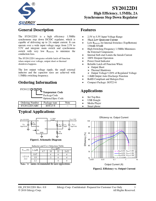 The SY20122D1 is a high efficiency 1.5MHz synchronous step down DC/DC regulator, which is capable of delivering up to 2A output current. It can operate over a wide input voltage range from 2.5V to 5.5V and integrate main switch and synchronous switch with very low RDS(ON) to minimize the conduction loss.